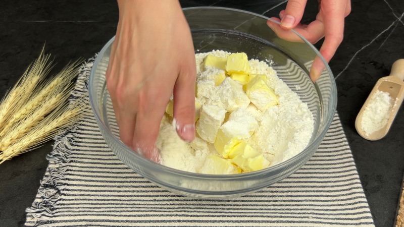 Toss in the butter and use your fingers (or a pastry cutter) to smush it into the flour until it looks like crumbly sand with a few pea-sized chunks.