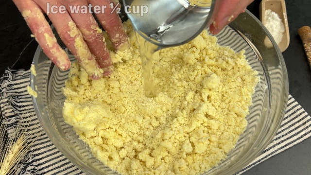 Slowly add ice water, a tablespoon at a time. Stir just until it holds together.