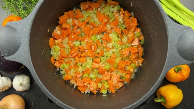 In the same pan, melt butter. Add onions, garlic, carrots, and celery. Cook until soft (about 8 minutes).